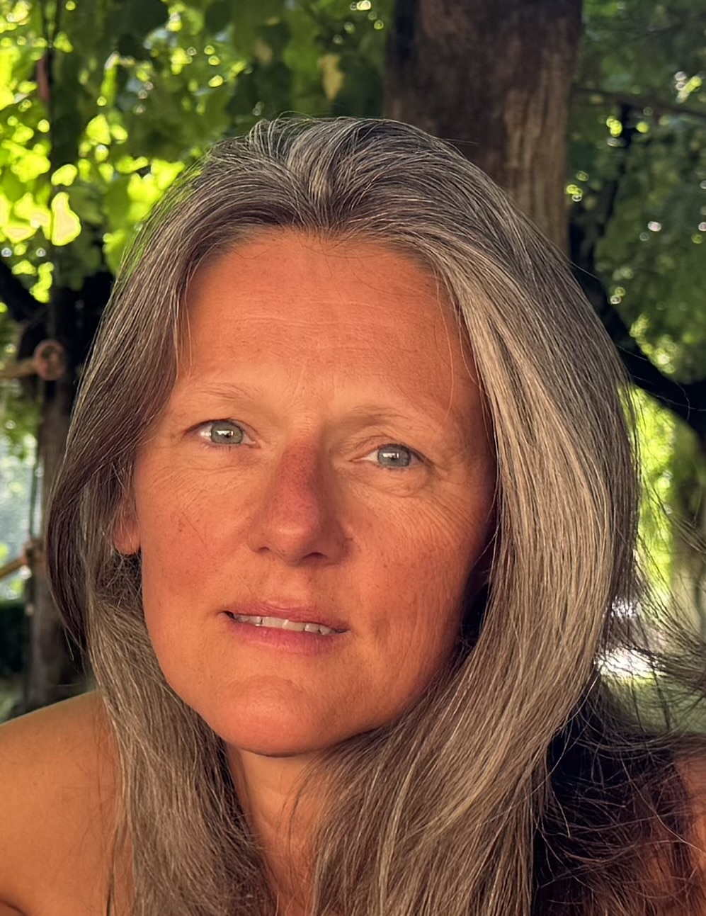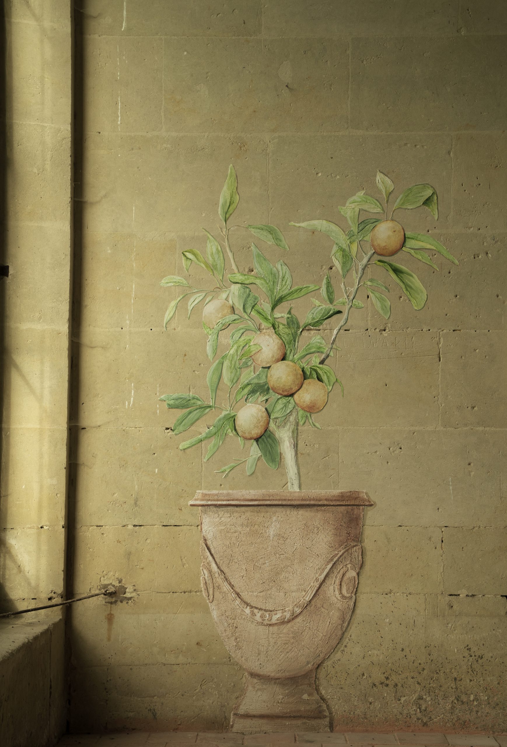 C’est dans l’orangerie du Château Hodébert qu’elle a choisi de réaliser une fresque représentant un vase d’Anduze et son oranger — sujet on ne peut plus juste pour ce lieu. La technique qu’elle emploie, l’affresco, du latin in fresco, « dans le frais », consiste à peindre les pigments directement sur l’enduit de chaux encore humide, permettant aux couleurs de pénétrer en profondeur dans la matière. Deux réactions chimiques, la carbonatation et la cristallisation, se produisent alors, protégeant durablement l’enduit et la couche picturale. Le geste doit être précis, rapide, sans repentir possible : chaque erreur est définitive. C’est précisément cette exigence qui confère aux fresques alfresco leur lumière si particulière et leur capacité à traverser les siècles.